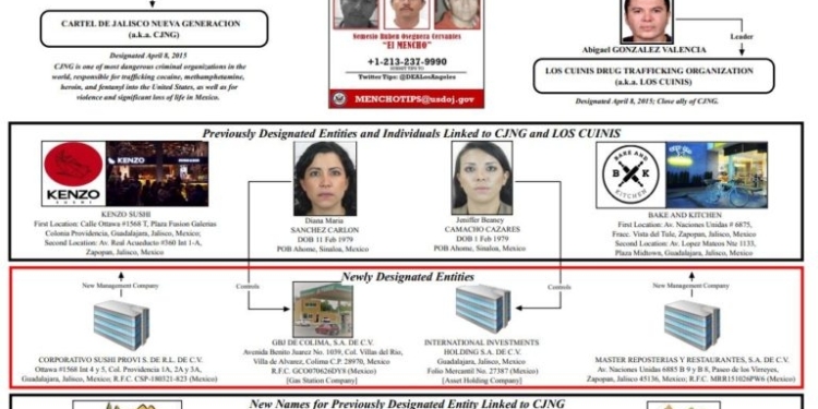 Redacción NoticiasMX.- Han sido señaladas y bloqueadas cuatro empresas mexicanas por el Departamento del Tesoro de Estados Unidos, de estar ligadas al Cártel Jalisco Nueva Generación (CJNG) y a “Los Cuinis”, informó una oficina de la Embajada de los Estados Unidos en México, con asiento en Tijuana.