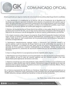 “La finalidad de traer estas vacunas era única y exclusivamente para ser aplicadas de forma gratuita a nuestros colaboradores y sus familiares. Dichas vacunas serían aplicadas siguiendo los protocolos de vacunación establecidos por las autoridades sanitarias de Honduras”.