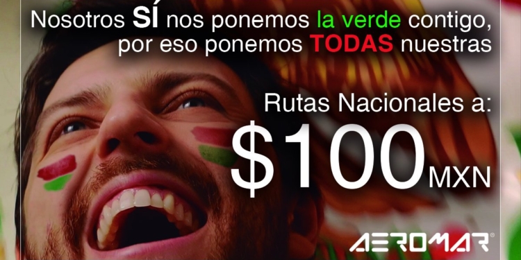 CIUDAD DE MÉXICO, 15 de septiembre (AlMomentoMX).- La aerolínea Aeromar anunció que venderá boletos de avión en 100 pesos (más impuestos) para todos sus destinos nacionales, como parte de una campaña para impulsar el turismo en temporadas bajas.