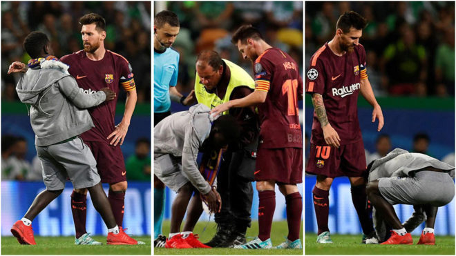 Allí, un aficionado saltó al campo de juego durante el encuentro de la segunda ronda de la fase de grupos de la Liga de Campeones, disputado entre el Sporting de Lisboa y el catalán Barcelona, para expresar de una manera peculiar su admiración a Messi.