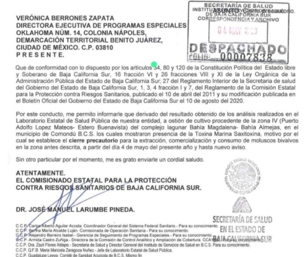 Se trata del resultado de los análisis hechos por un Laboratorio Estatal de Salud Pública del Estado de Baja California Sur, a ostiones de cultivo procedente del predio comprendido entre el Puerto Adolfo López Mateos y el Estero Buenavista, parte del complejo lagunar Bahía Magdalena-Bahía Almejas, en el municipio de Comondú, B. C. S., donde fueron hallados vestigios de la presencia de la toxina marina ‘saxitoxina’, motivo por el cual se establece el cierre precautorio para la extracción, comercialización y consumo de moluscos bivalvos (almejas, mejillones, ostras-ostiones) en la zona antes descrita, a partir del día 4 de mayo de los corrientes y hasta nuevo aviso.