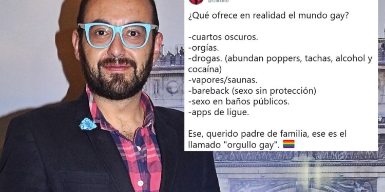 En el tuit, el exconductor de televisión asegura que el “mundo gay” es sinónimo de cuartos oscuros, drogas, sexo en baños públicos, entre otras actividades, además pidió a los padres de familia cuestionarse si en realidad es digno de conmemorarse el mes del orgullo LGBT.