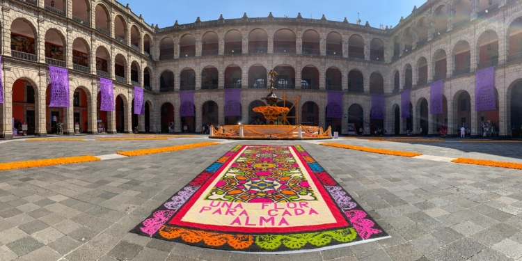 Integrantes de 20 pueblos originarios distintos encabezaron la ceremonia, en la que colocaron múltiples caminos de flores de cempasúchil, y altares en los arcos del patio.