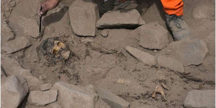 Un equipo de The Associated Press vio el jueves el esqueleto de largo cabello negro tendido boca arriba con las extremidades inferiores atadas con una cuerda trenzada de enredaderas de origen vegetal.La momia estaba rodeada de piedras enterrada a un metro (tres pies) de profundidad.