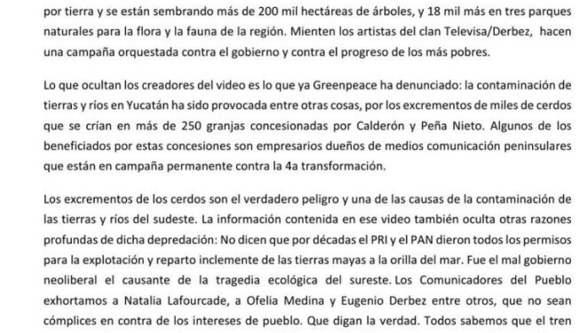 CIUDAD DE MÉXICO.-La “Red de Comunicadores del Pueblo” criticó a las actrices, actores, cantantes e “influencers” que protestaron mediante un video por el cambio de ruta del Tren Maya, además de calificarlos como “ecologistas de buró”, pues aseguraron que el clan “Televisa/Derbez hacen una campaña orquestada” contra el gobierno de Andrés Manuel López Obrador y “contra el progreso de los más pobres”.