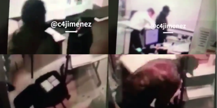 De acuerdo con videos de seguridad, divulgados por el periodista Carlos Jiménez en su cuenta de Twitter, el atraco inició cuando un hombre vestido de negro con una maleta y que finge hablar por teléfono. El sujeto camina hacia la entrada y se queda parado por unos segundos.