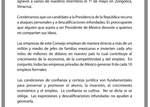 CIUDAD DE MÉXICO, 3 de mayo (AlMomentoMX).— El Consejo Mexicano de Negocios (CMN) rechazó “las expresiones injuriosas y calumniosas del candidato presidencial de la coalición Juntos Haremos Historia, Andrés Manuel López Obrador.