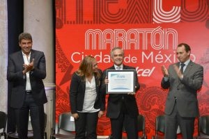 El mandatario capitalino recibió dos reconocimientos, el primero por parte de la vicepresidente de la Association of International Marathons and Distance Races (AIMS), Martha Irene Morales Villalobos.