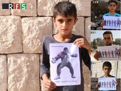 Otras fotografías muestran a sirios con dibujos de los superhéroes y con mensajes como “Vengadores, reúnanse, salven Aleppo”.