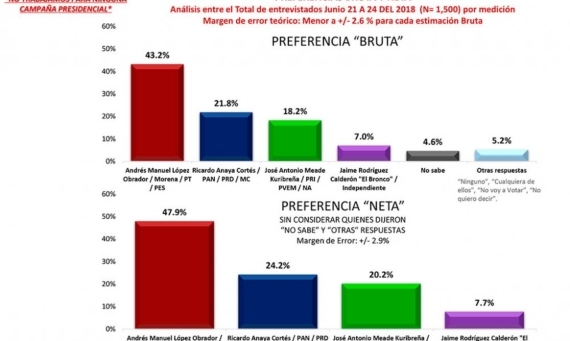 La Encuesta Nacional que ayer diera a conocer la casa Indemerc viene muy parecida a la publicada por la misma a principios de mes, el 8 de junio, por lo que es muy probable que AMLO rebase por poco el 50% de los votos. De acuerdo a los encuestadores Vicente Licona Galdi y Vicente Licona Cortés, existe esa posibilidad: que López Obrador sea el Presidente que cuente con mayor legitimidad en la historia de nuestro país.