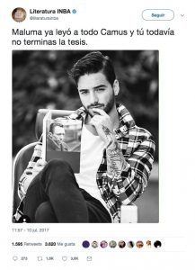 Literatura INBA publicó la imagen en blanco y negro del intérprete de “Felices los 4” con la leyenda: “Maluma ya leyó a todo Camus y tú todavía no terminas la tesis”.