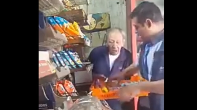 Mientras acomoda el producto en los anaqueles, el sujeto toma unos paquetes y los guarda entre su ropa, aprovechando que el anciano se dirige hacia la parte trasera del mostrador. Durante el video, el repartido le insiste que le está dando un descuento “por tratarse de usted, por ser cliente distintivo”.