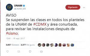 Leer másDetailsCIUDAD DE MÉXICO, 19 de septiembre (AlMomentoMX).- La Universidad Nacional Autónoma de México (UNAM) suspendió sus clases, luego del temblor...