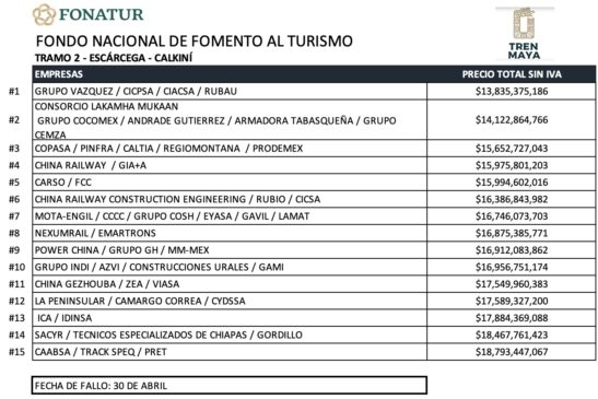 Entre quienes no alcanzaron los primeros sitios está el grupo de Copasa, Pinfra, Caltia y Regiomontana; que ofertó 15,652 millones de pesos; La China Railway y GIA+A, cuya oferta fue de 15,975 millones de pesos.