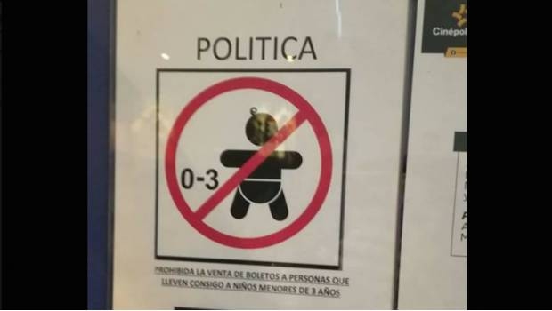 En el cartel, al parecer colocado en un complejo VIP ubicado en Campeche, Cinépolis detalla que por “política” queda “prohibida la venta de boletos a personas que llevan consigo a niños menores de 3 años”.