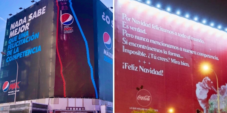 CIUDAD DE MÉXICO, 24 de diciembre (AlMomentoMX).— Hace unos días, Coca-Cola aprovechó la Navidad para mandar un mensaje de reflexión y felicitación a su máximo rival a través de carteles publicitarios en varias ciudades de España. En respuesta, Pepsi también colocó su propio saludo en el que felicita a su competencia. Eso sí, sin mencionar el nombre de cada uno.