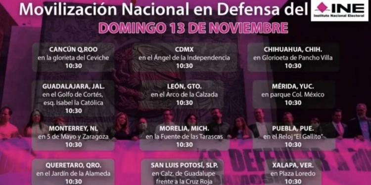 De acuerdo con publicaciones en redes sociales, en el marco de la defensa del INE habrá movilizaciones, además de la CDMX, en ciudades como: Cancún, Guadalajara, Mérida, León, Monterrey, Morelia, Puebla, Querétaro, San Luis Potosí y Xalapa.