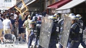 En Marsella, desde la noche del jueves hasta este viernes, aficionados de ambas selecciones se han lanzado botellas, destrozado cristales y golpeado con sillas de los establecimientos de la zona, provocando la intervención de cientos de policías con material antidisturbios.