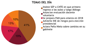 Por otro lado, también destaca en medios que el Instituto Nacional para la Evaluación de la Educación (INEE) informó que la evaluación de desempeño docente 2016 será obligatoria sólo para los 24 mil maestros que obtuvieron resultado insuficiente en el proceso del año pasado, mientras que el resto de los docentes la prueba será voluntaria.
