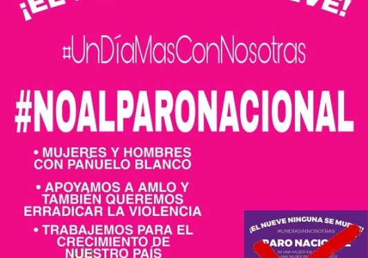 Redacción NoticiasMX.- Surge una especie de “contrapropuesta” para el próximo lunes 9 de marzo, bajo las consignas de “#NOALPARONACIONAL”, “EL NUEVE ME MUEVE” y “#UnDíaMásConNosotras”.