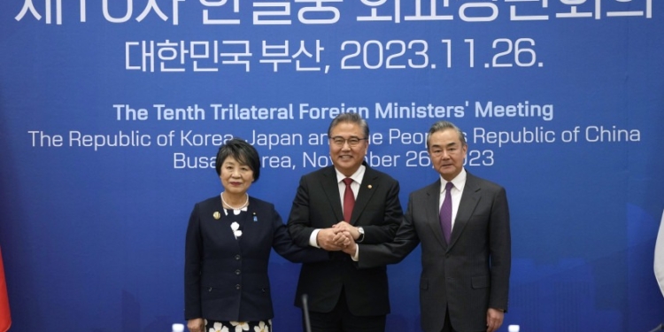 «Nosotros tres ministros acordamos restaurar y normalizar la cooperación entre tres naciones en una fecha próxima», dijo el Ministro de Relaciones Exteriores de Corea del Sur a los periodistas después de su reunión con Yoko Kamikawa de Japón y Wang Yi de China en Busan, Corea del Sur.