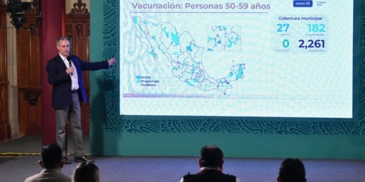 Presentamos el avance de la vacunación contra #COVID19 al personal educativo y a personas de 50 a 59 años. El propósito de la política de vacunación es de salud pública, no de atención médica individual; es un programa gratuito y universal del Gobierno de México. pic.twitter.com/1DUSePbN7V