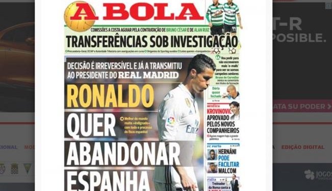 No es la primera vez que A Bola especula con una posible salida de Cristiano del Madrid. La semana pasada aseguraban que el Manchester United, el PSG y el Mónaco preparaban una oferta de 180 millones de euros por el jugador blanco.