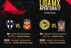 CIUDAD DE MÉXICO, 27 de noviembre (AlMomentoMX).- La Liga MX anunció las fechas y horarios en que se disputarán los partidos de ida y vuelta de las semifinales del Apertura 2017. El miércoles y el jueves se efectuará el ‘primer capítulo’ de las series mientras que entre sábado y domingo conoceremos a los finalistas.