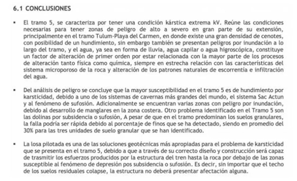 “La evaluación del peligro kárstico no puede soslayarse para ninguno de los tramos del Tren Maya, de lo contrario, aumentará la probabilidad de que durante la construcción y operación del tren ocurran eventualidades no deseadas e inclusive peligrosas”.