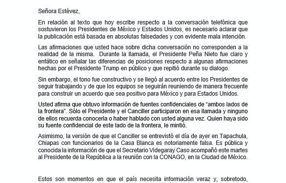 CIUDAD DE MÉXICO, 1 de febrero (AlmomentoMX).- La Secretaría de Relaciones Exteriores emitió un comunicado en donde aclara que la publicación de la periodista Dolia Estévez, respecto a la llamada del presidente Peña Nieto y Donald Trump es falsa.