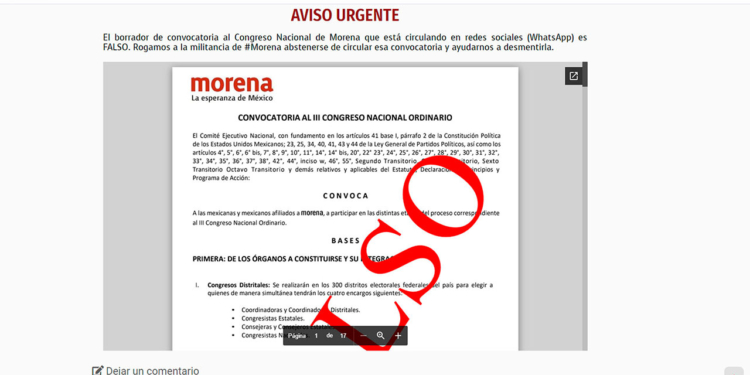 En la página del partido político hay a la vista un “Aviso Urgente”: “Rogamos a la militancia de #Morena abstenerse de circular esa convocatoria y ayudarnos a desmentirla”.