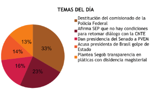 Por otro lado, también destaca en medios que el secretario de Gobernación, Miguel Ángel Osorio Chong, aseguró que si se retoman las negociaciones con la Coordinadora Nacional de Trabajadores de la Educación (CNTE), el diálogo será transparente y público.