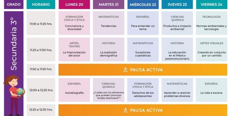 Mientras que, para Segundo de Secundaria, los horarios de transmisión local serán de 9:30 a 11:00 y de 16:30 a 17:55 horas.