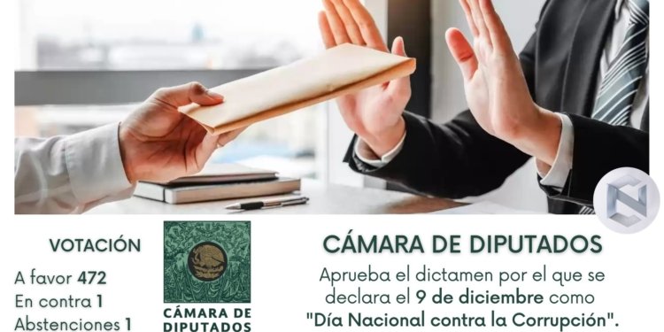 Con 472 votos a favor, 1 en contra y 1 abstención, se aprueba dictamen por el que declara el 9 de diciembre como Día Nacional contra la Corrupción. Pasa al Senado de la República. pic.twitter.com/jcONCC3H9F