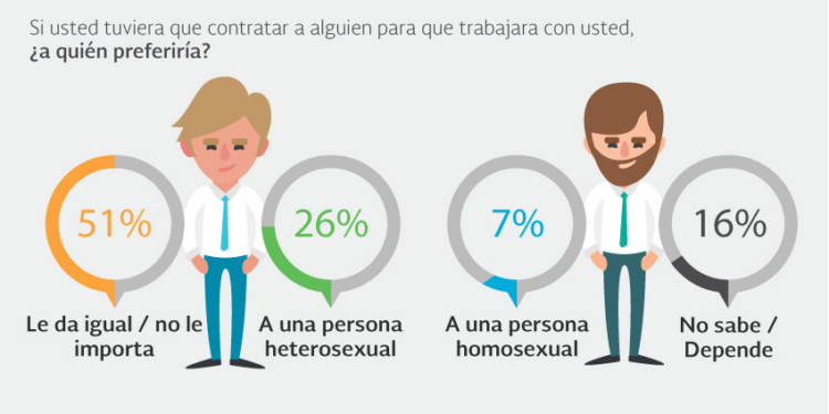 Además, 26 % de los encuestados dijeron que preferirían contratar a una persona heterosexual, mientras el resto indicó que la contratación sólo dependería de las habilidades de la persona.