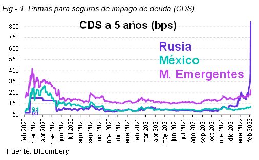 Por ejemplo, la prima de un seguro contra un impago de Rusia se ha disparado muy por encima de los peores niveles del inicio de la pandemia, mientras que, la de México y en general de los mercados emergentes se ha mantenido relativamente estable y considerablemente menor respecto al inicio de la pandemia.