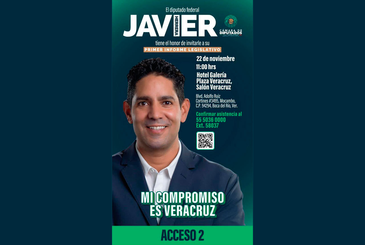 Este próximo sábado a las 11:00 horas en conocido hotel del municipio de Boca del Río, el diputado federal del PVEM, Javier Herrera Borunda dará su Primer Informe Legislativo.. Una situación poco extraña porque el Primer Informe de Gobierno de la gobernadora Rocío Nahle, será el próximo 30 de noviembre.. Pero conociendo como se maneja el hijo del ex gobernador Fidel Herrera Beltrán.. Que es mucho de cuidar las formas políticas.. Seguro pidió “permiso” a la mandataria estatal y lo consultó con Palacio Nacional y debe tener el “visto bueno”.. Pero ese anuncio, ya ha dado muchas “lecturas”..