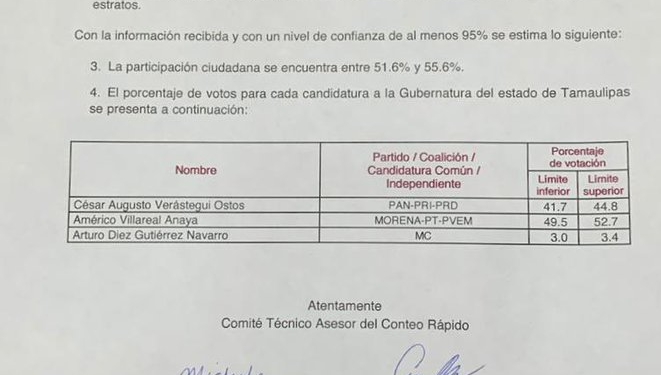 CIUDAD VICTORIA, TAMAULIPAS.- Américo Villarreal Anaya (Morena, PT, PVEM) aventaja en la elección para gobernador en Tamaulipas, de acuerdo con los resultados preliminares del instituto electoral local (Ietam) y Consulta Mitofsky.