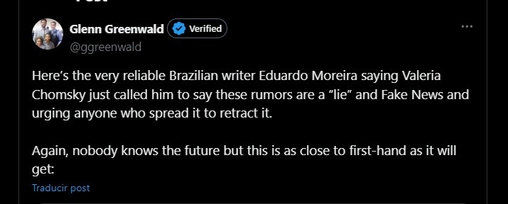 Sin embargo, el escritor brasileño Eduardo Moreira ha desmentido dicha información y asegura que Noam Chomsky se encuentra bien; habría sido su esposa Valeria Chomsky quien confirmó que estos rumores son falsos.