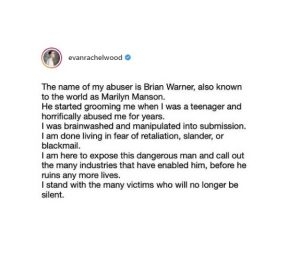 Mediante un comunicado que compartió en sus redes sociales, en donde Evan Rachel Wood reveló que Marilyn Manson abusó de ella durante muchos años.