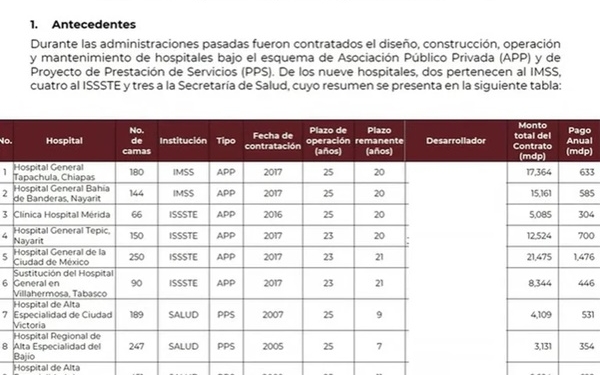 López Obrador detalló que de acuerdo con un reporte de Hacienda, con la cantidad que se paga en un año a los nueve hospitales alcanzaría para construir la misma cantidad de centros médicos.