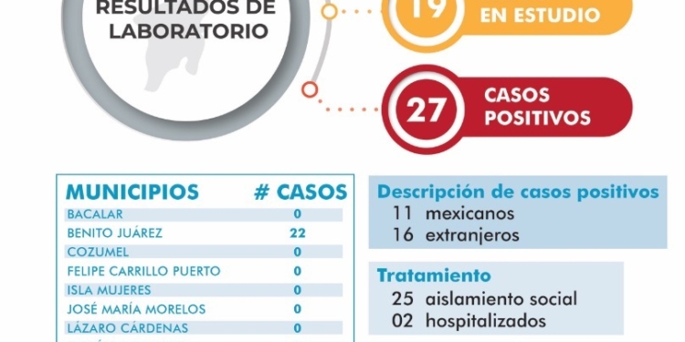 De los casos positivos, la mayoría están en Benito Juárez (Cancún) con 22 pacientes; cuatro en el municipio de Solidaridad (Playa del Carmen) y uno más en la capital del estado.