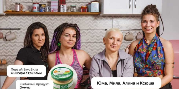 El anuncio del minorista de alimentos Vkusvill mostraba a las cuatro mujeres de la familia en una cocina y decía que les gustaban las bolas de arroz japonesas de la tienda con champiñones y su humus.