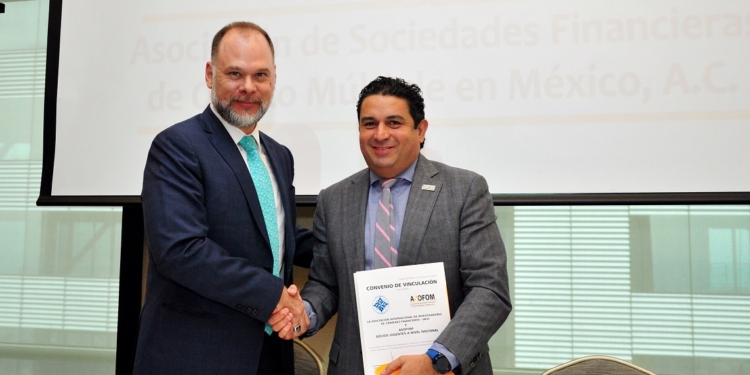 Firmaron este convenio Adolfo González Olhovich, Presidente Nacional de la ASOFOM, y Carlos Lang Merino, Presidente del Capítulo Latinoamericano de IAFCI en la reunión trimestral de socios de la ASOFOM reunidos para celebrar esta firma acompañados de otras asociaciones, organismos del sector financiero y de la academia.