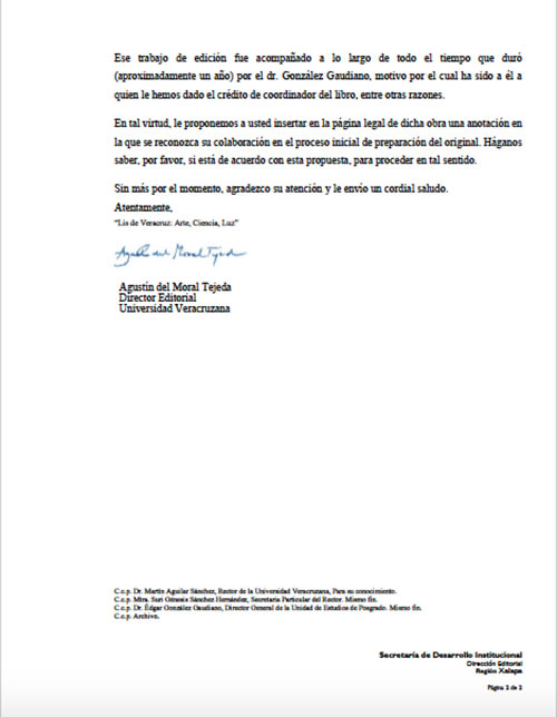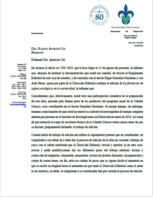 Hasta el oficio de fecha 30 de agosto de 2024, firmado por Agustín del Moral Tejeda, Director Editorial de la Universidad Veracruzana en el que responde que (…) “efectivamente, usted tuvo una participación sustantiva en la preparación de esta obra, (…) cuyo coordinador era el doctor González Gaudiano”.