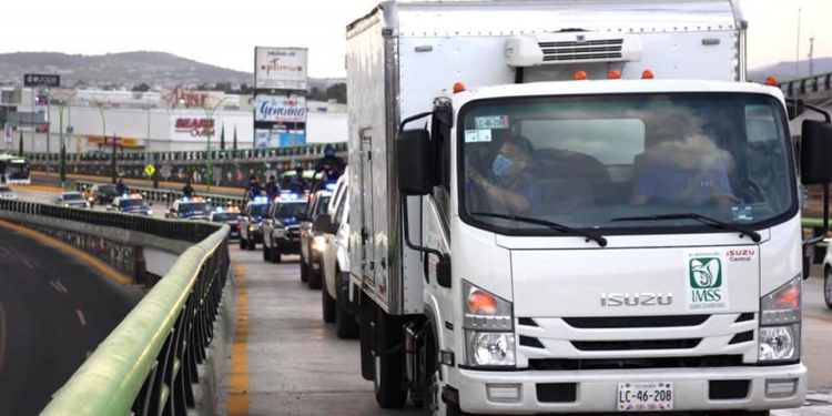Las vacunas llegaron desde la Ciudad de México a la ciudad de Pachuca y fueron trasladadas a la 18ª Zona Militar de la capital del estado por escoltas de la Secretaría de la Defensa Nacional (Sedena).