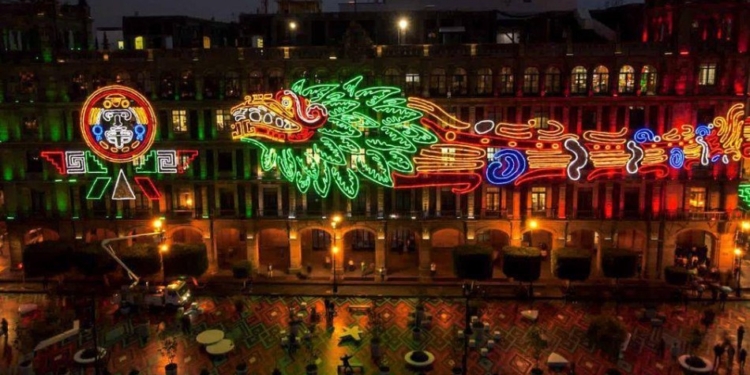 El edificio de Gobierno de la Ciudad de México fue adornado con un conjunto luminoso con forma de serpiente emplumada en punto de fuga, al extremo izquierdo se ubica Tonatiuh, Dios del Sol, grecas aztecas y una pirámide tricolor.