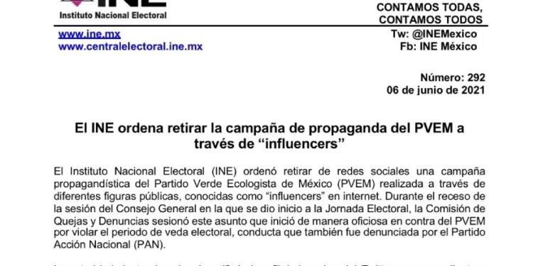 Ciudad de México-. El Instituto Nacional Electoral (INE) ordenó retirar de redes sociales una campaña propagandística del Partido Verde Ecologista de México (PVEM) realizada a través de diferentes figuras públicas, conocidas como “influencers” en internet.
