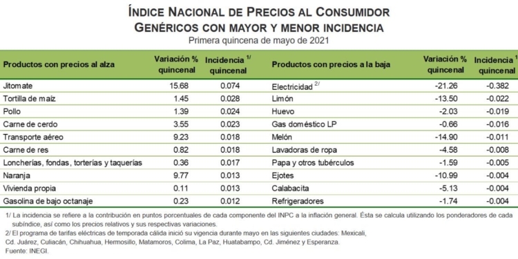 Los productos que más aumentaron de precio y que tuvieron una mayor incidencia en la inflación durante la primera quincena de mayo fueron: jitomate (15.68 por ciento), naranja (9.77 por ciento), transporte aéreo (9.23 por ciento); carne de cerdo (3.55 por ciento), tortilla de maíz (1.45 por ciento) y pollo (1.39 por ciento).