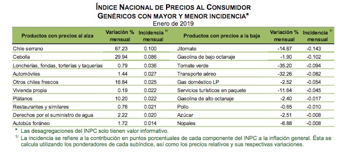 Los productos que mostraron un mayor aumento fueron el chile serrano, con una variación mensual del 67.23 por ciento; la cebolla, con 29.94; otros chiles secos, con 16.84; el plátano, con 10.20; y los derechos por el suministro de agua con 2.22 por ciento.
